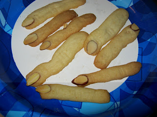 Finger cookies and mummy dogs! My sister-in-law made these and I thought they were just too cute not to share. The fingers are sugar cookies with almonds for nails and went great with coffee, and the mummy dogs are sausages wrapped in garlic crescent dough and were sooo yummy.